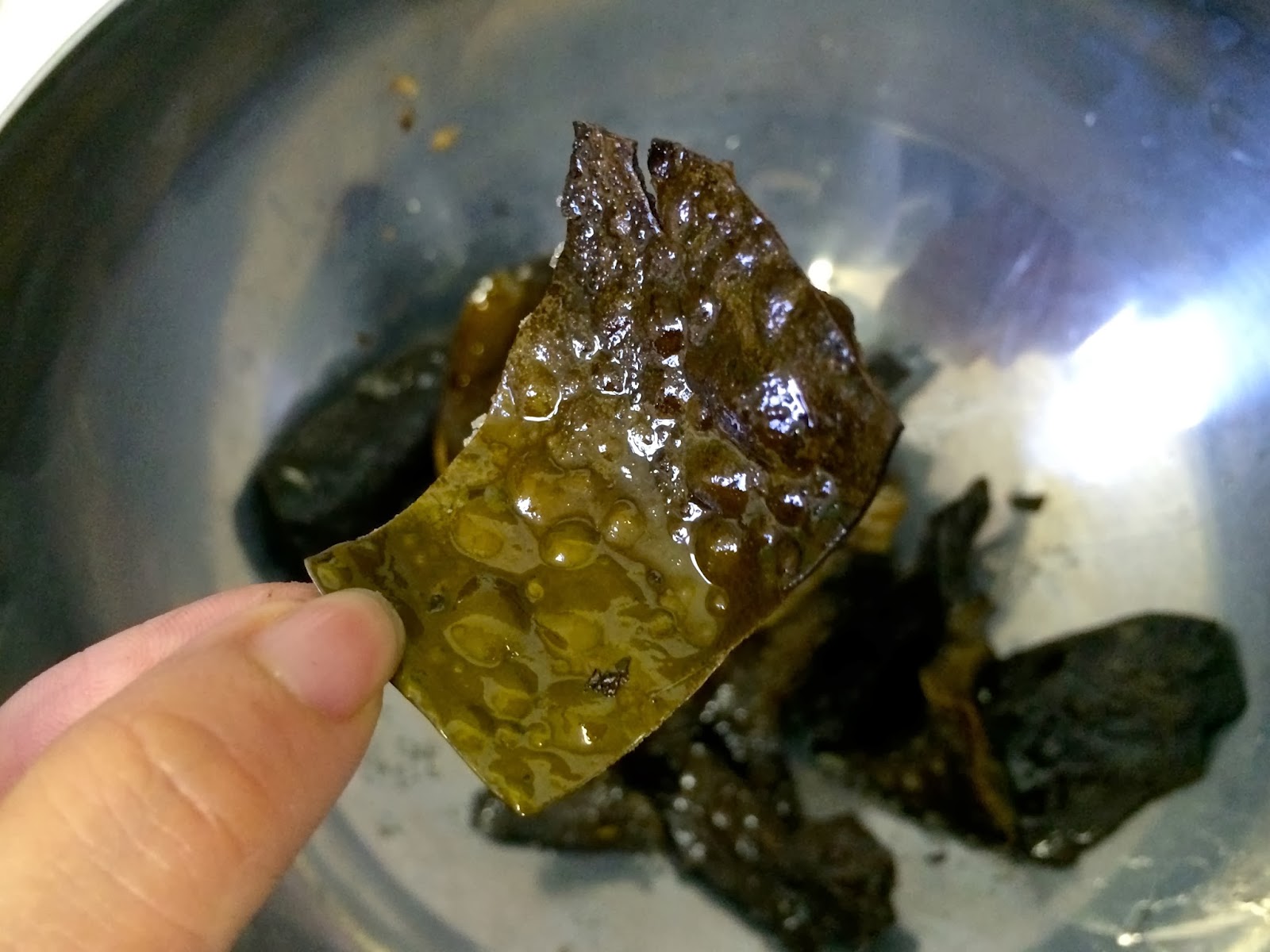 The sea tangles become bigger once you cook. They are crunchy, salty and sweet. Unless you really hate sea weedy taste, this is so addicting. They are totally vegan and good for constipation.
